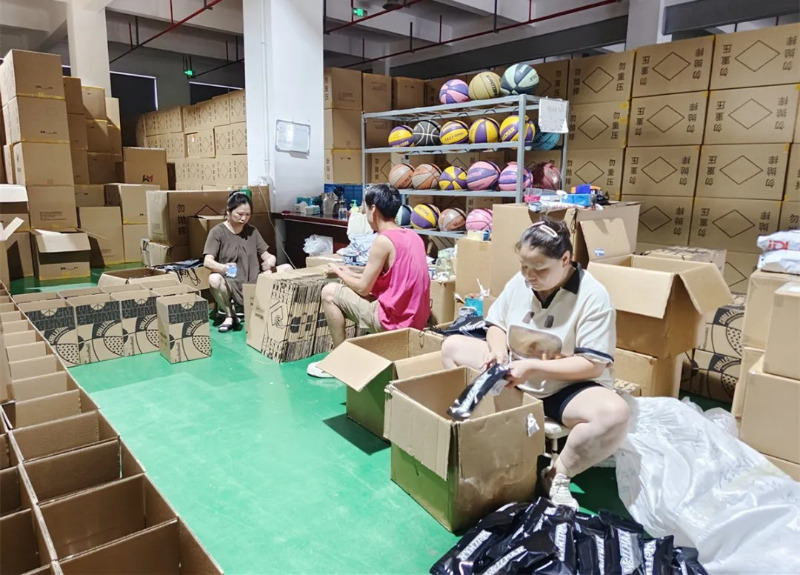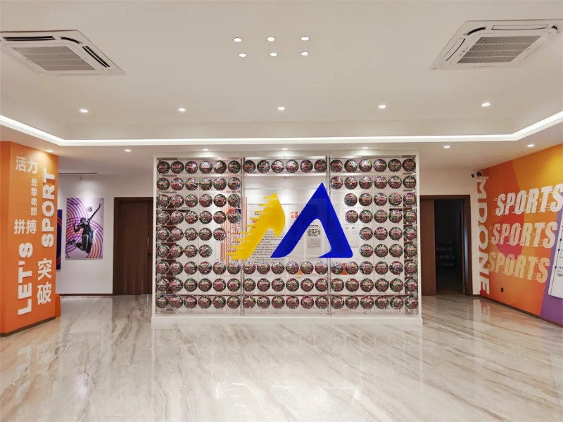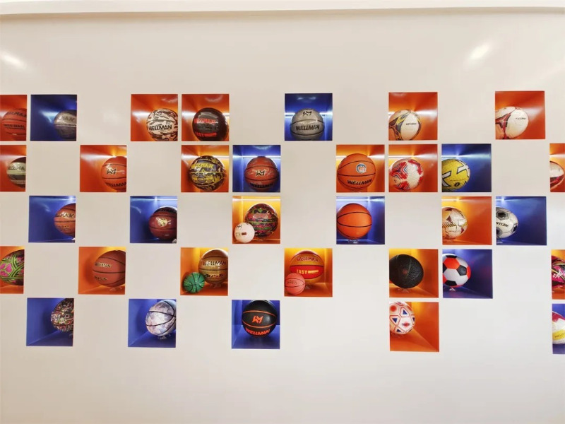 Di bilik pameran produk Meidong Sports, terdapat berpuluh -puluh bola keranjang, bola sepak dan produk bola tampar gaya dan warna yang berbeza.
